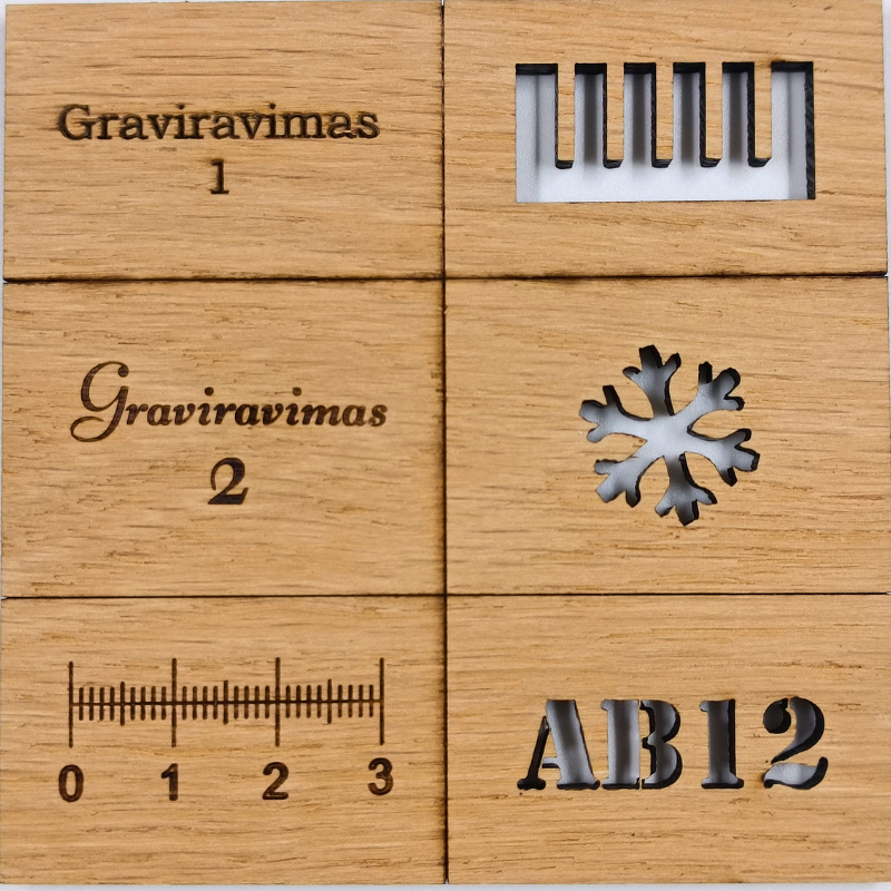 Dėl natūralios medžio tekstūros graviravimo vaizdas gali šiek tiek kisti skirtingose vietose – tai laikoma natūralaus masyvo savybe, o ne defektu. Jei reikalingas švaresnis paviršius, prieš graviravimą gali būti naudojama apsauginė lipni juosta, sumažinanti suodžių nusėdimą.